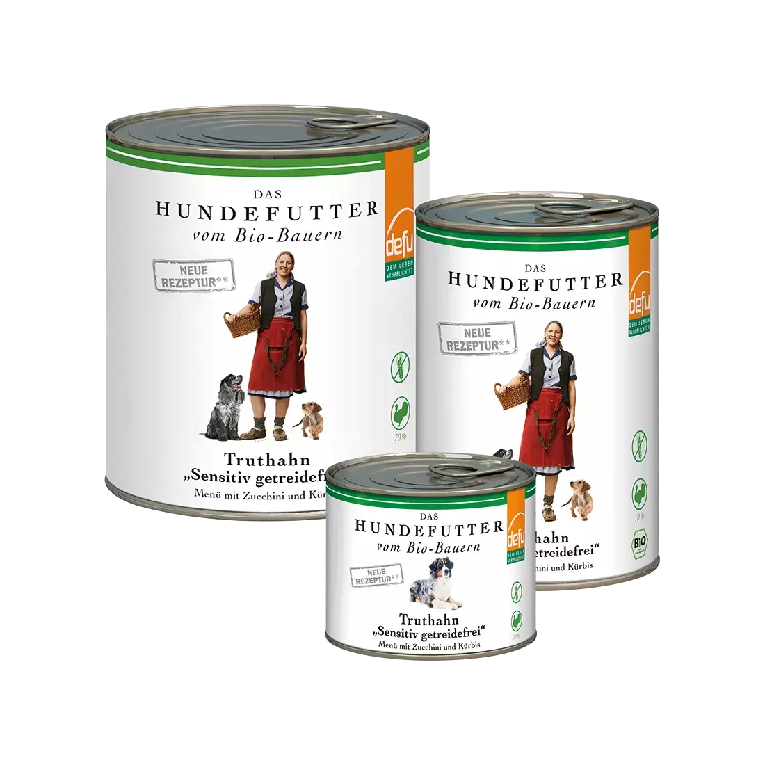 Zusammensetzung: 70 % Truthahn* (Fleisch, Herz, Hals, Leber, Karkasse), 15,5 % Zucchini*, 13 % Kürbis*, Mineralstoffe, Sonnenblumenöl*, Lichtwurzel*.
