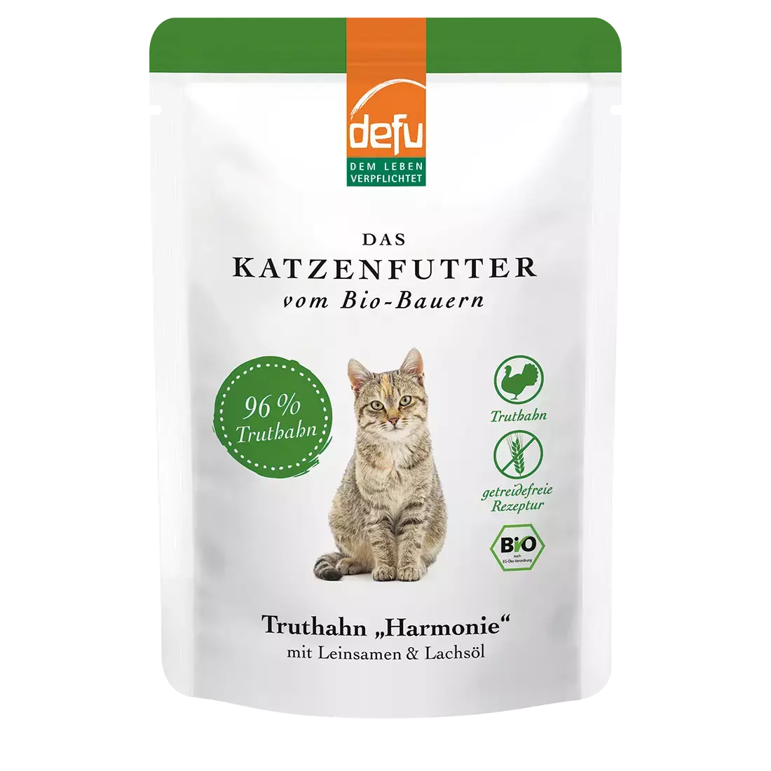 Premium-Alleinfuttermittel in Bio-Qualität für Katzen. Verfeinert mit Leinsaat und edlem Lachsöl.