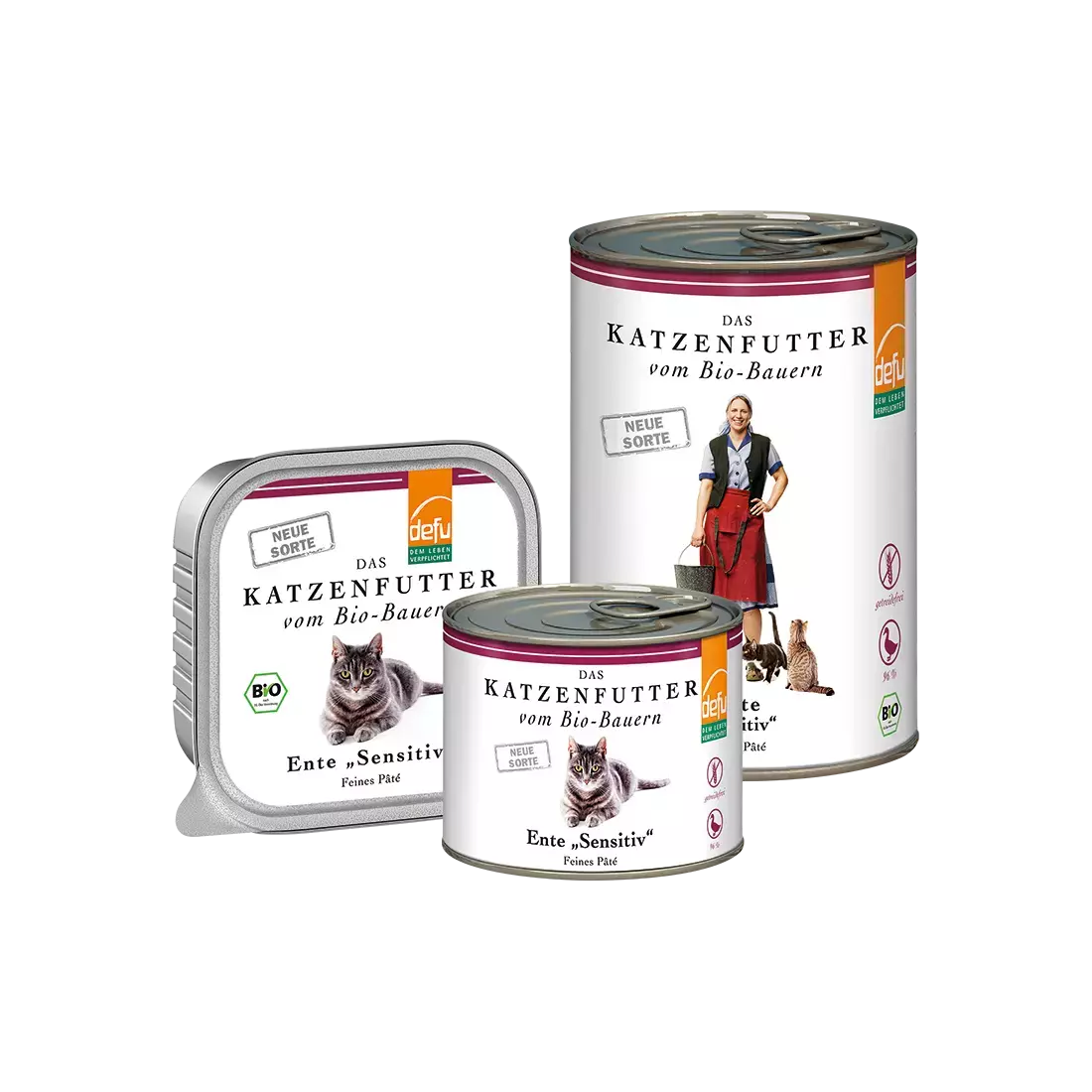 Premium-Alleinfuttermittel in Bio-Qualität für erwachsene Katzen.Feines Pâté mit Ente, Kürbis und Sonnenblumenöl.